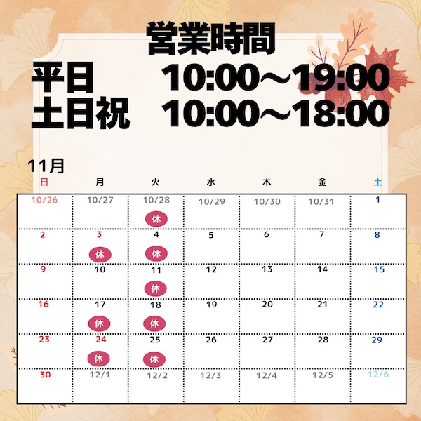 11月の営業日程と、好評をいただいている出張修理サービスについて詳しくご案内いたします。